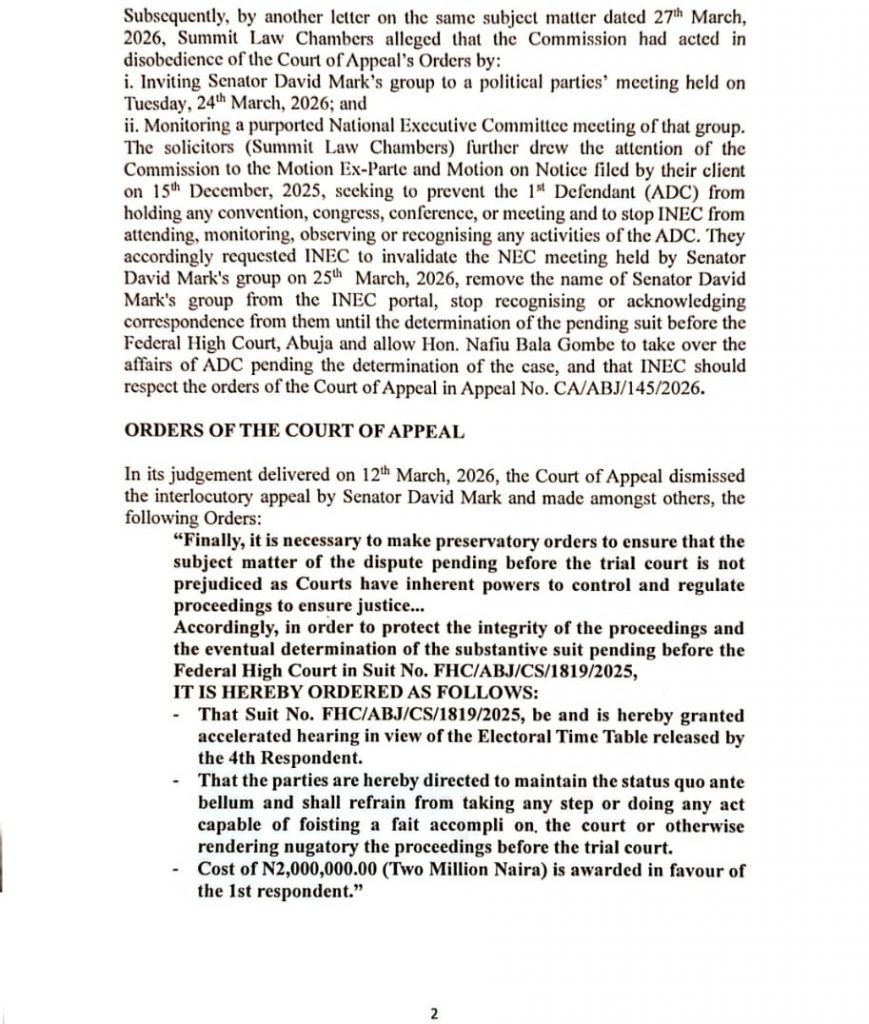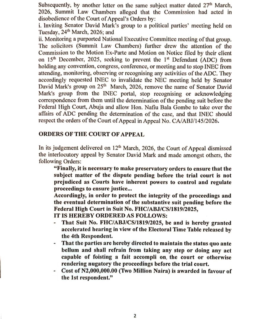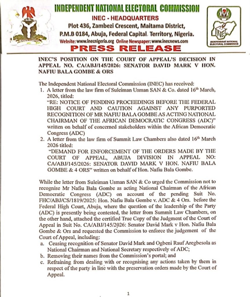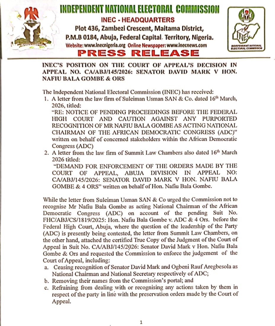 ADC MATTERS:INEC’S POSITION ON THE COURT OF APPEAL’S DECISION IN APPEAL NO. CA/ABJ/145/2026