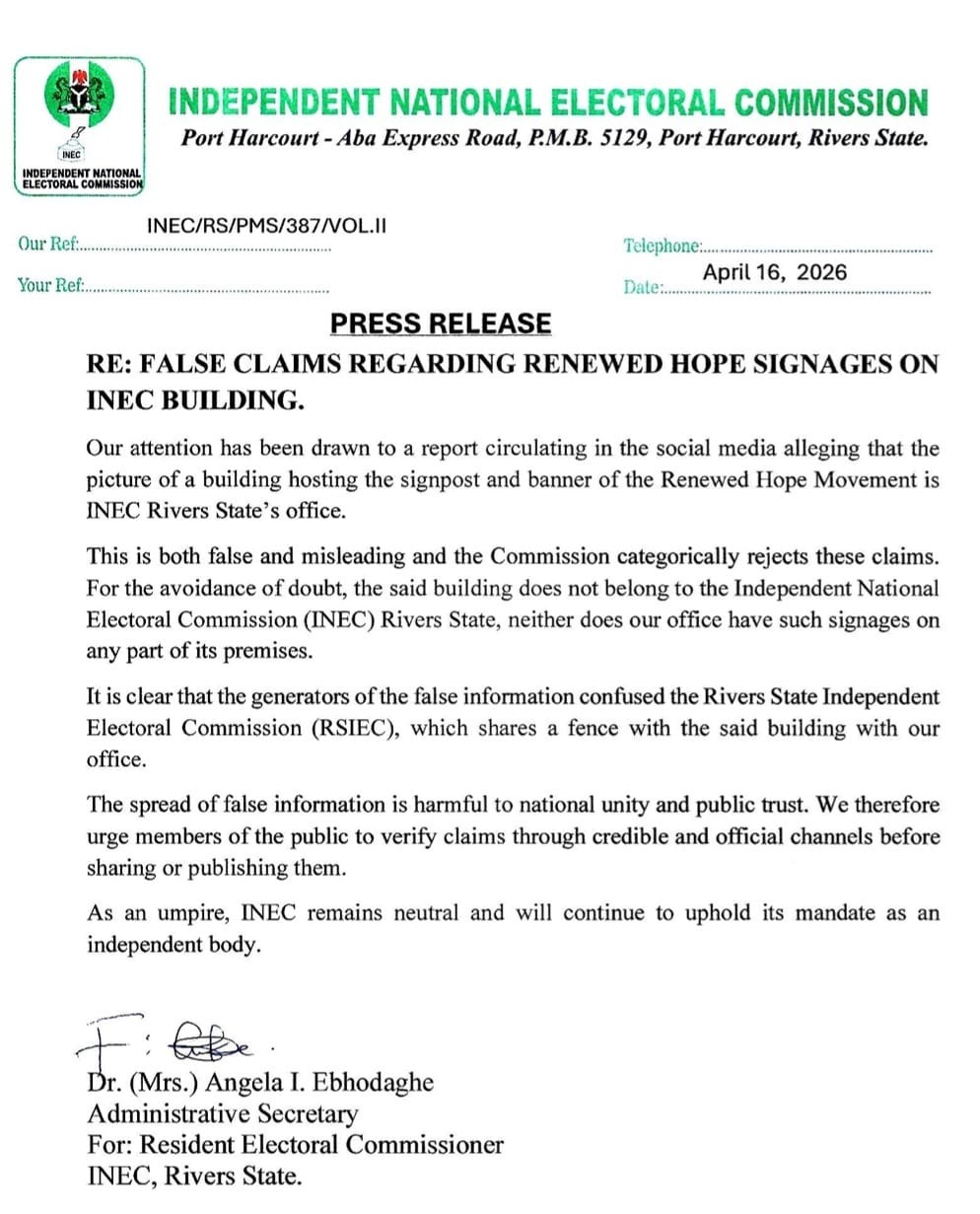 FALSE CLAIMS REGARDING RENEWED HOPE SIGNAGES ON INEC BUILDING