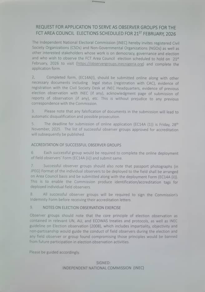 REQUEST FOR APPLICATION TO SERVE AS OBSERVER GROUPS FOR THE FCT AREA COUNCIL ELECTIONS SCHEDULED FOR 21ST FEBRUARY, 2025