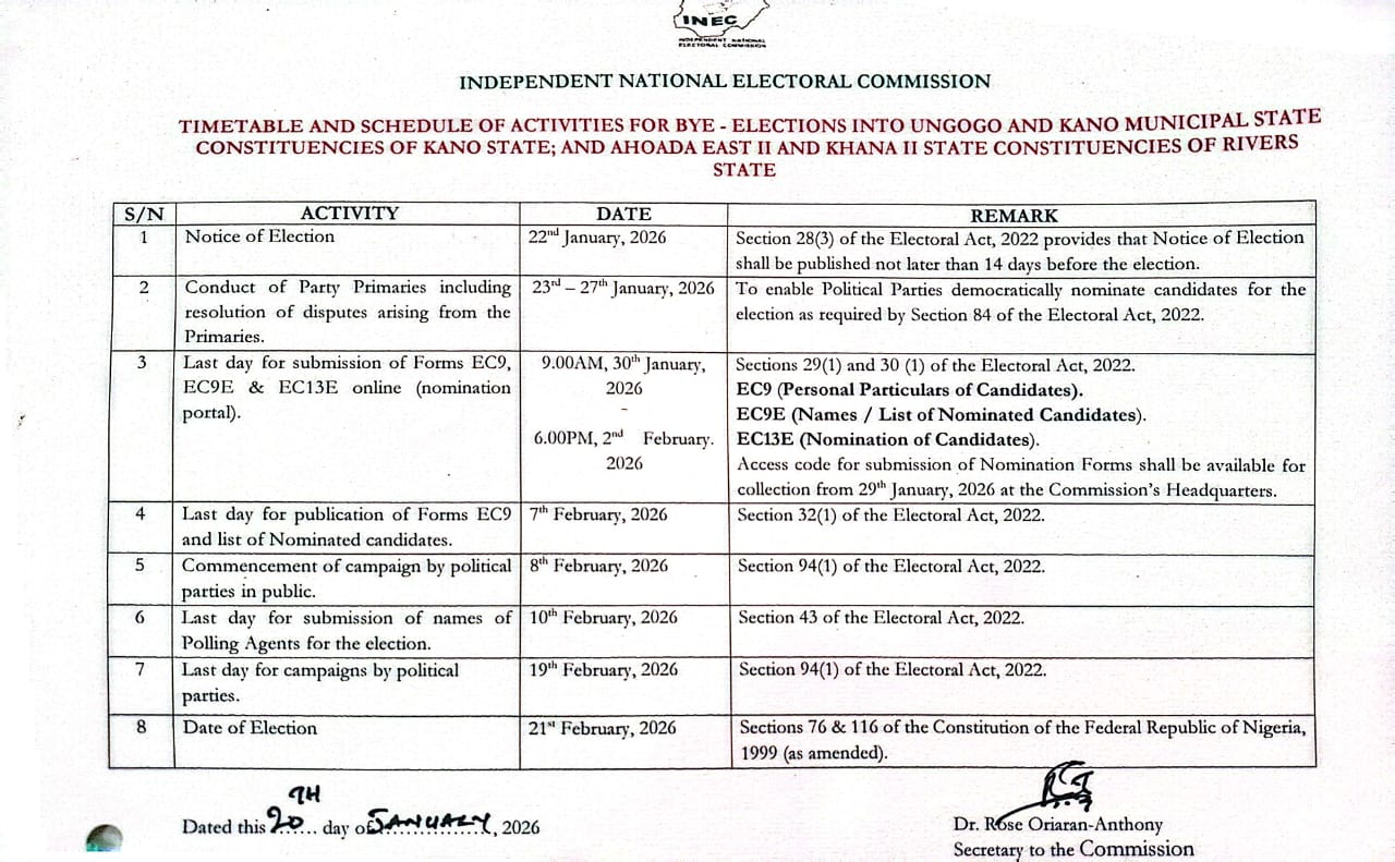 TIMETABLE AND SCHEDULE OF ACTIVITIES FOR BYE-ELECTIONS SCHEDULED TO HOLD ON 21st FEBRUARY, 2026