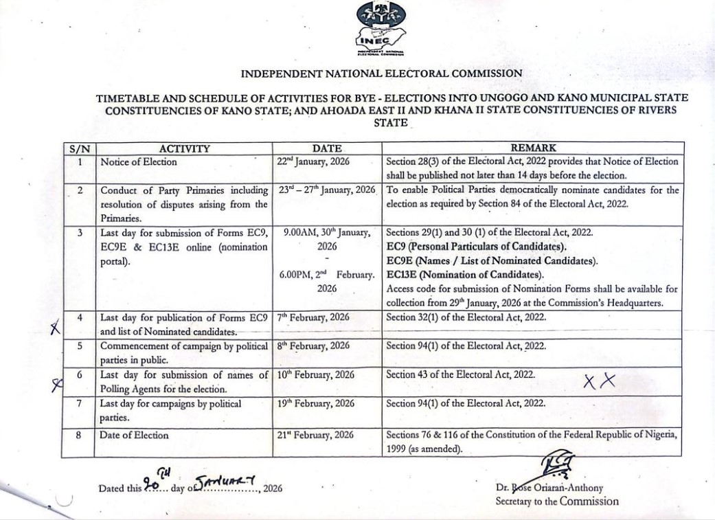 TIMETABLE AND SCHEDULE OF ACTICITIES FOR BYE-ELECTIONS SCHEDULED TO HOLD ON 21st FEBRUARY, 2026
