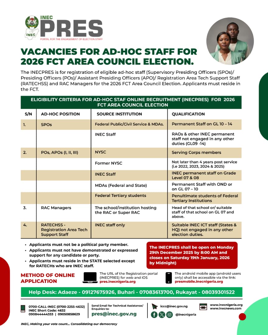 VACANCIES FOR ADHOC STAFF FOR 2026 FCT AREA COUNCIL ELECTIONS